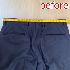 私たちの専門技術と経験を活かして、お客様のご要望に合わせてスラックスのウエストを2㎝出しました。ウエスト後ろがV字の作りになっているのでV字を生かして、ウエスト出しをすることでよりスタイリッシュな印象に仕上げることができます。シンプルなデザインながら、細部にまでこだわった一本です。